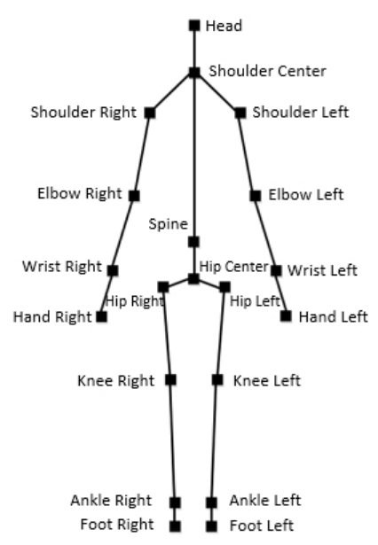 In this project Kinect V1 is used for skeletal tracking. Kinect is a low cost motion sensing camera created by Microsoft. Kinect has an RGB camera, 3D depth sensor on the front. The skeletal tracking algorithm detects the joints of the human using the RGB camera and the 3D depth sensor. It represents the joints as a point (x,y,z) in a 3D space. The skeletal data acquired from Kinect is 20 joint-points of the human being tracked. The graphic shows the skeletal joints the kinect returns.The goal of this project is to mimic the upper body movement of the human. Therefore, the focus will be on 8 joint points out of the 20 acquired from Kinect. The joint points of interest are the following: shoulder, elbow, wrist and hip for both the left and right sides.